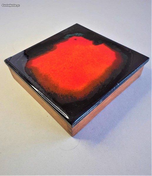 Descrição/Decoração - De forma quadrada, tampa em madeira com placa aposta/colada em cerâmica vidrada policromada onde predomina a cor laranja forte ( característico da época) ao centro, há castanhos e verdes