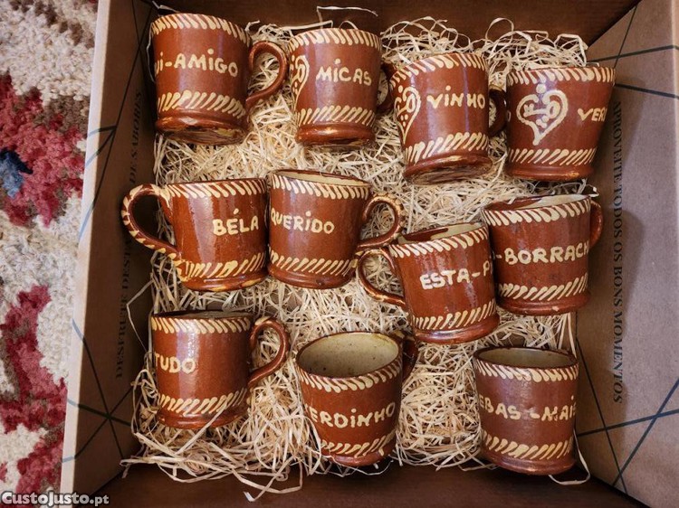 Conjunto de 11 canecas rústicas em barro com frases populares. Anos 50 do século passado.