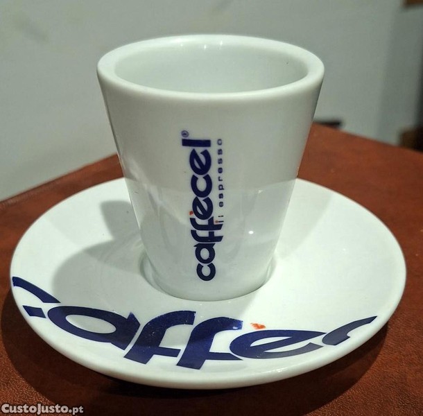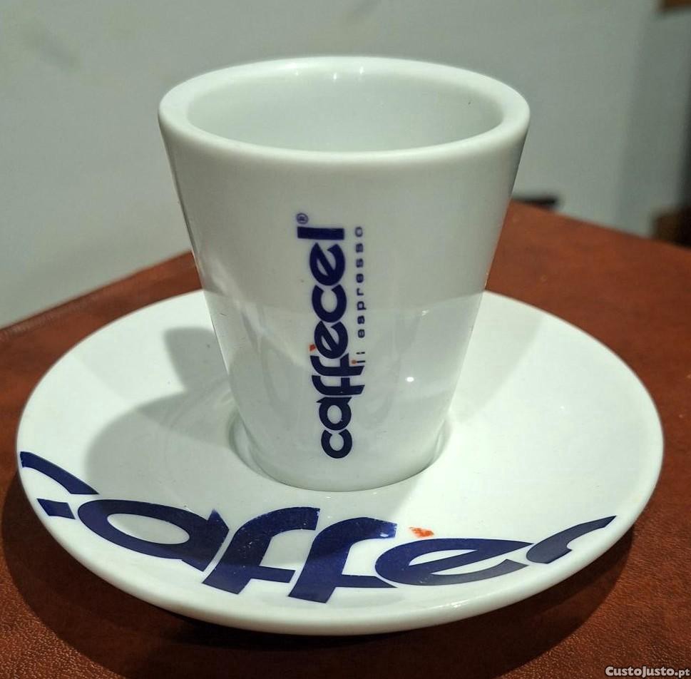 Chávena e pires de café em porcelana da Caffecel Expresso, em estado de novo, muito indicado para colecionadores de chávenas de marcas de café.