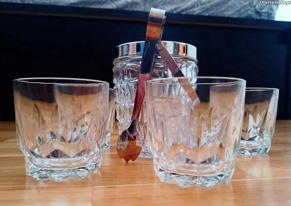 Conjunto de 5 copos para whisky com balde de gelo com pega para os cubos. Em excelente estado.
