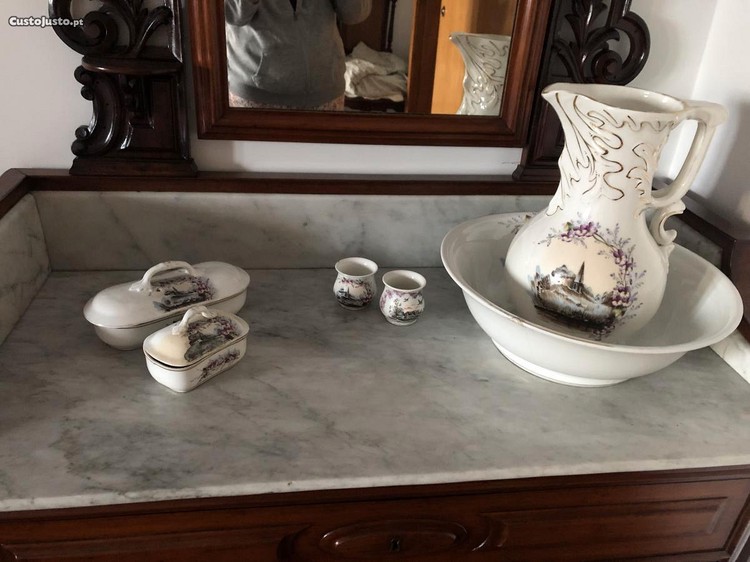 Preço: 250 €Conjunto de jarro, bacia, saboneteira, caixa para escova de dentes e 2taças pequenas vista alegre