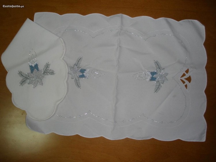 Conjunto de pano de tabuleiro mais pano cesta do pão bordado com motivos de natal.