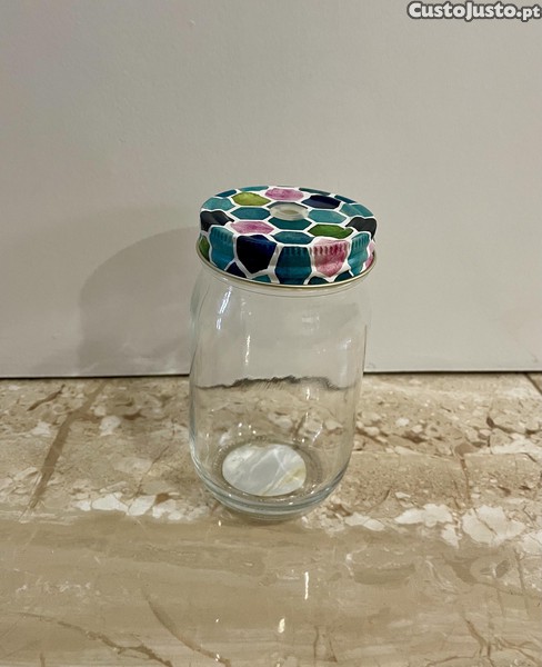De vidro. Tampa metálica de tons azuis, verdes e cor de rosa, com abertura para palha. Palha não incluída. Sem asa.