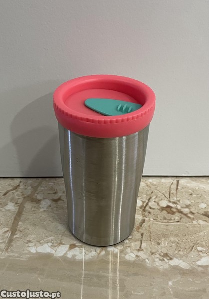 De metal prateado, com tampa plástica e interior em cor de rosa vivo. Detalhe de ondulações na borda da tampa. Dá para tapar o bocal, com uma peça azul-esverdeada que desliza. Com fundo com borracha. Sem asa.