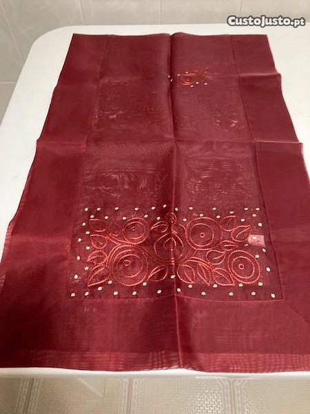 Corre mesa com 2 guardanapos. O corre mesa mede 1,45x0,46 e os guardanapos medem 42x42.