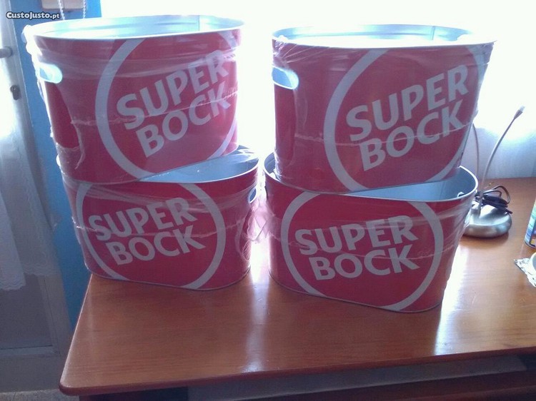 Baldes para gelo da cerveja Super Bock,para conservar as cervejas frescas ou para decoração de, churrasqueira ou cafés ou para arranjo de flores. tenho 2 baldes cada balde leva 14 cervejas o valor é cada um