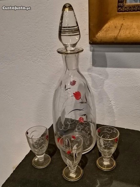 Preço: 22 €Garrafa de licor e três copos em vidro