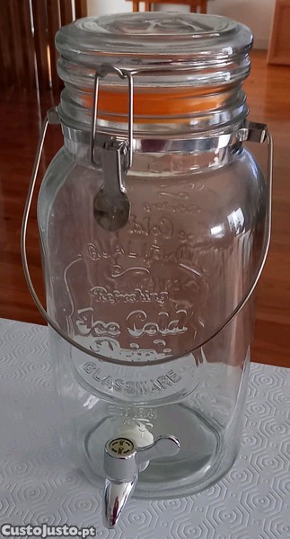 Jarro de vidro com torneira, útil para dispensar água em casa ou para usar em mesas de festa/piqueniques.