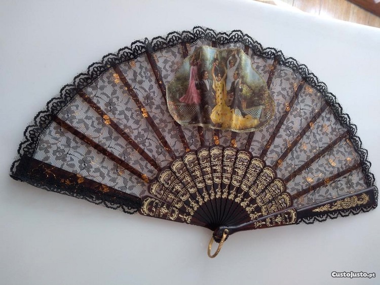Leque de mão vintage, em baquelite, de renda preta e fios dourados, com decoração de dança espanhola do salero em tecido, na parte central.