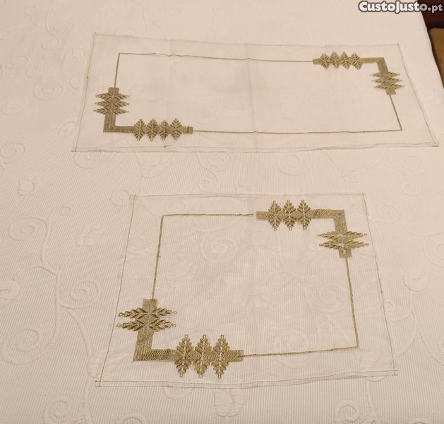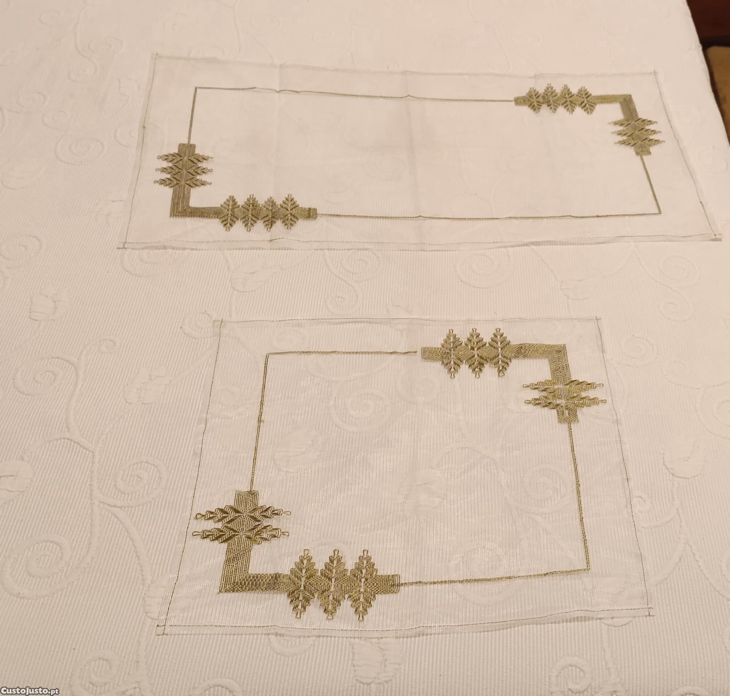 Conjunto de 2 Naprons, , brancos, em tecido finíssimo, tipo rede , minuciosamente feitos e bordados á mão, com um trabalhado absolutamente elegante, em verde seco mas brilhante. O fio de bordar é apenas de uma só cor, mas dado os vários tipo de pontos, a sua cor verde altera em alguns pontos mediante a luz.