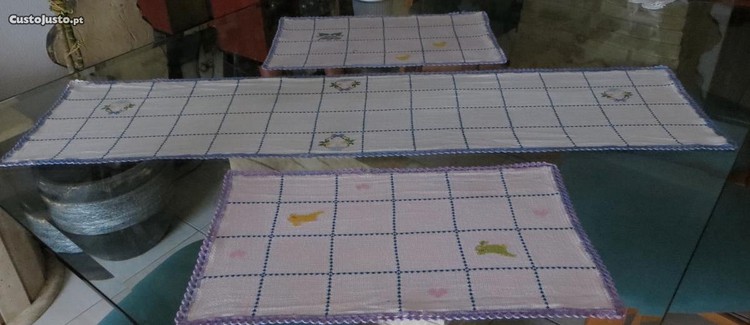 Conjunto de 3 naprons cozinha, orlados em croché lilás matizado e bordados a ponto cruz