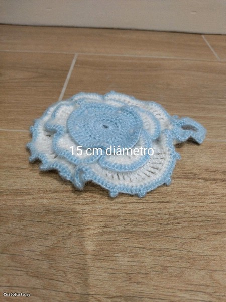 Em lã azul e branca, em crochet