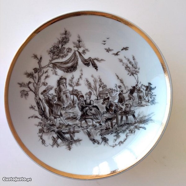 Pires de chávena de café em porcelana Artibus - Aveiro, com filete dourado no bordo, e decoração a preto e branco de paisagem, com diversas figuras, de tocador, grupo a dançar e cena amorosa.