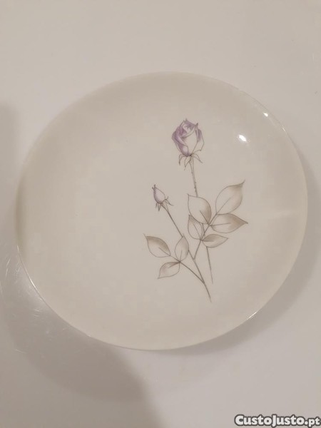 Prato raso em porcelana Coimbra S.P., com decoração de rosas violeta e folhas sépia.