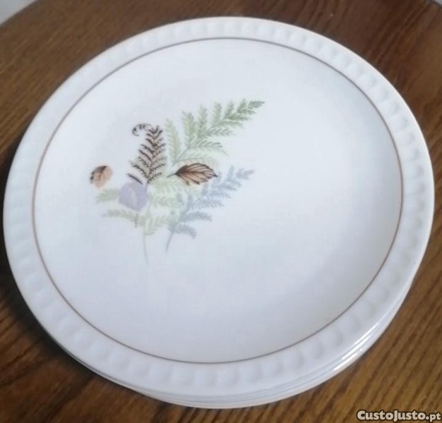Pratos de doce (5) em porcelana Vista Alegre 1971 a 1980, decoração policromada folhas (1 c/defeito, conforme quarta fotografia), e o diâmetro de 15,7cm.