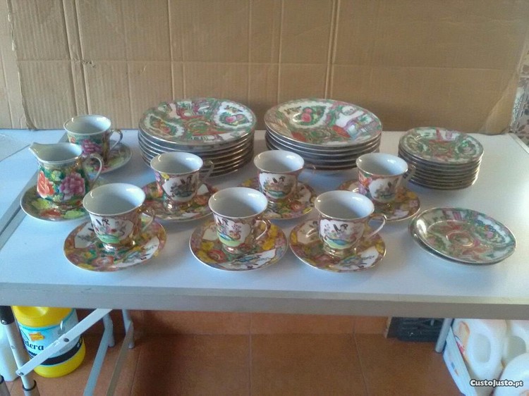 Conjunto de 41 peças de louça japonesa composta por 8 pratos rasos 6 de sopa 11 de sobremesa 6 chávenas com os respectivos pires 1chavena mais 2pires mais uma caneca pequena as flores as 6 chávenas mais os pires porcelana fina tem decoração uma japonesa