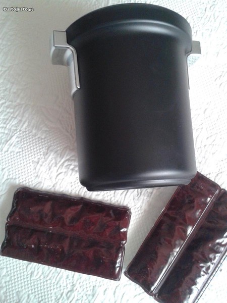 Refrigerador / frapé / cooler, tipo balde para 1 garrafa ou gelo material tipo plástico iso-térmico de paredes duplas, com câmara isolante para manutenção de frio durante 4 horas - cor preta marca VALIRA / made in Spain - com 2 elementos / acumuladores de frio, plásticos.