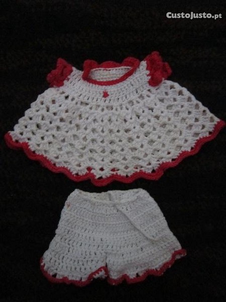 vendo roupa de boneca em renda ou croché vestido e calção em branco e rebordo vermelho. preço fixo: 8EUR. não pretendo ofertas nem trocas.