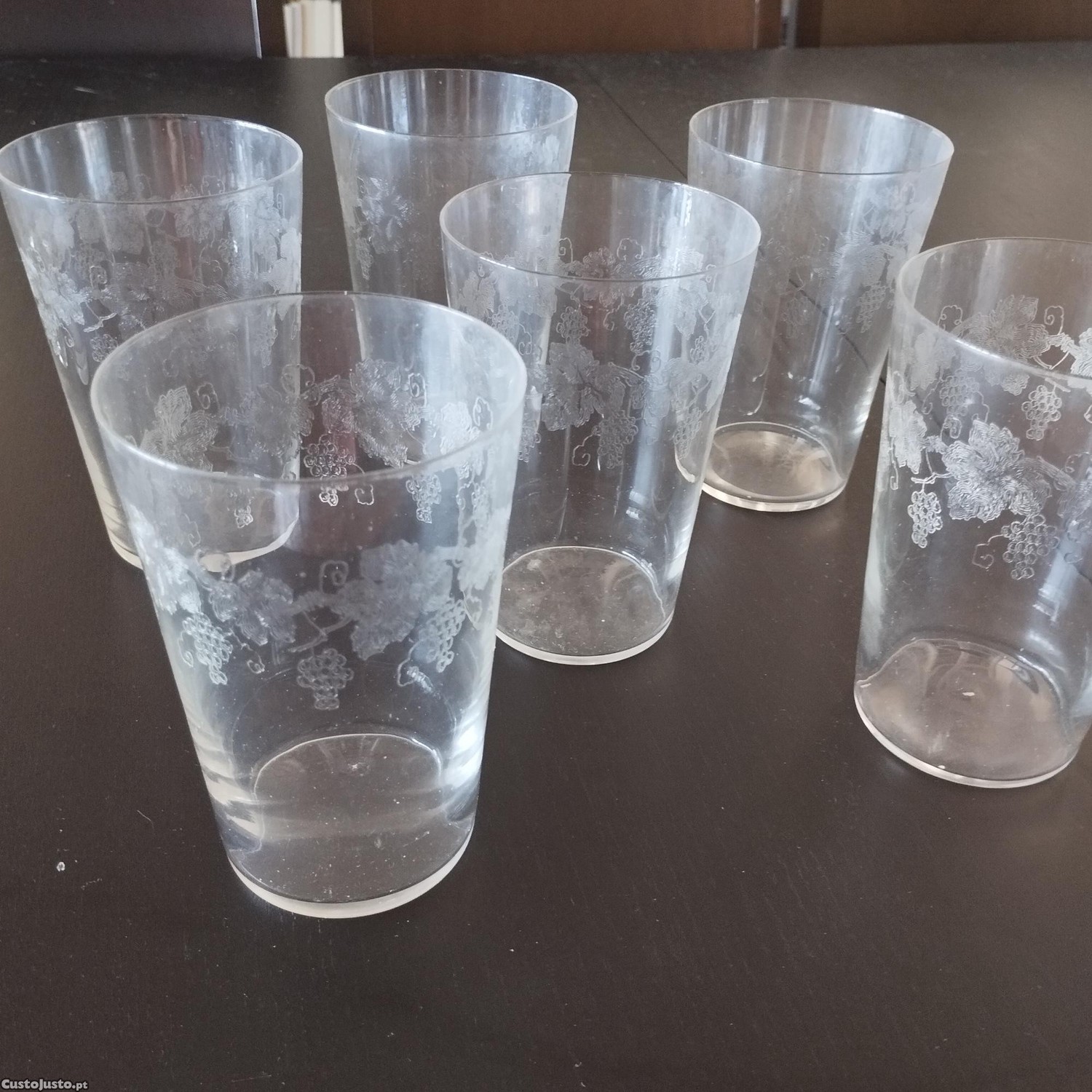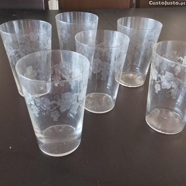 Seis copos de refresco antigos em bom estado com desenhos lavrados