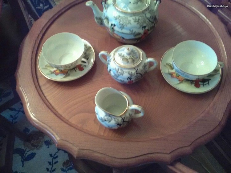 Serviço de chá oriental de sete peças, 2 chávenas e pires, bule, caneca, e açucareiro impecável