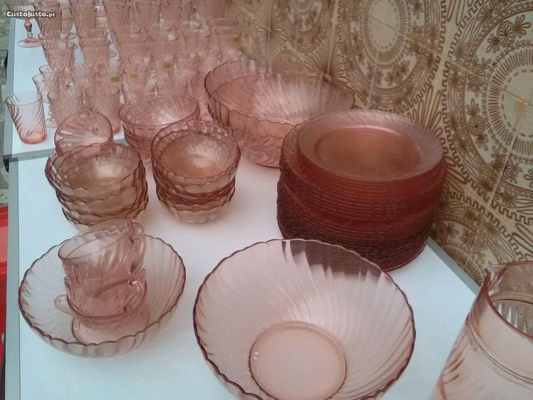 Serviço de jantar 68 peças 24 rasos,6 de sopa, 6 de sobremesa, 3 saladeiras de 3 tamanhos diferentes, 6 chávenas mais pires, 12 taças para saladas de frutas, 4 taças para azeitonas ou outros, com mais de 50 anos novo o preço é por tudo . Marca Arcopal francês