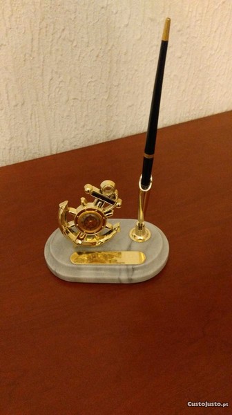 Vendo suporte de caneta com base em mármore e termómetro em dourado.