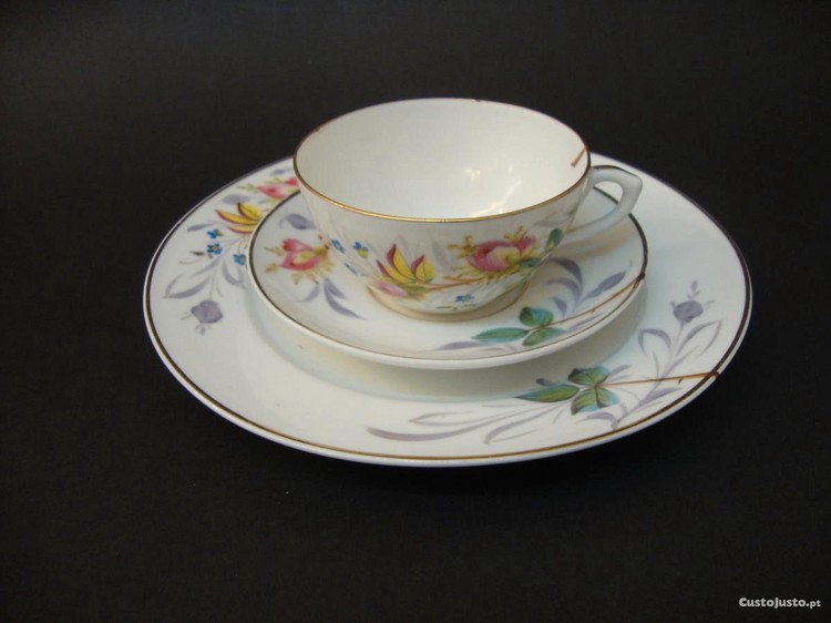 Chávena, pires e prato de doce ( conjunto ), em porcelana da Vista-Alegre, Século XIX, pintado totalmente à mão. Decoração invulgar e muito, muito rara.