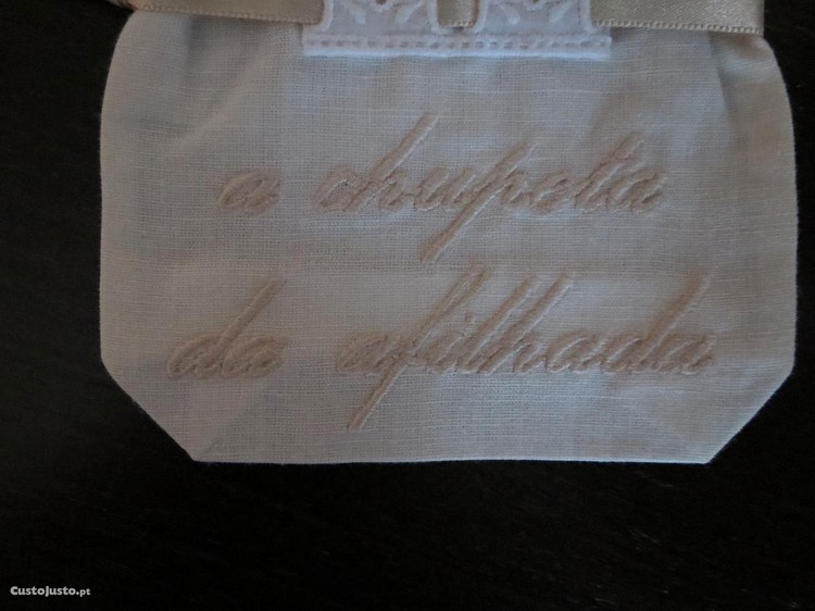 Bolsinha para guardar a chupeta em tecido alinhado e bordado a bege (renda de cima é diferente)