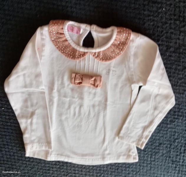 Preço: 8 €Camisola branca, gola em coral com brilhantes e laço igual - 2-3 anos