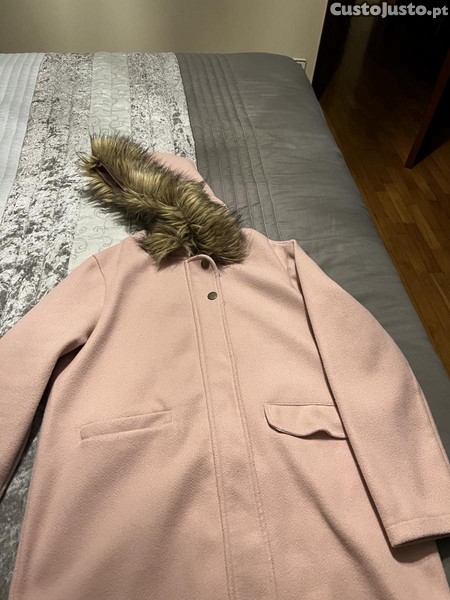 Casaco de criança cor de rosa, com comprimento 3/4 e carapuço com pelo removível à volta, em poliester, com bolsos.