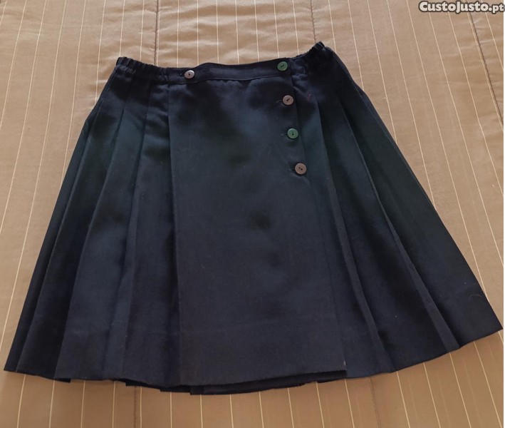 Saia Azul, em Fazenda, toda às pregas exceto um pouco à frente onde é lisa e trespassa às pregas, trespassar, apertando de lado com 4 botões.