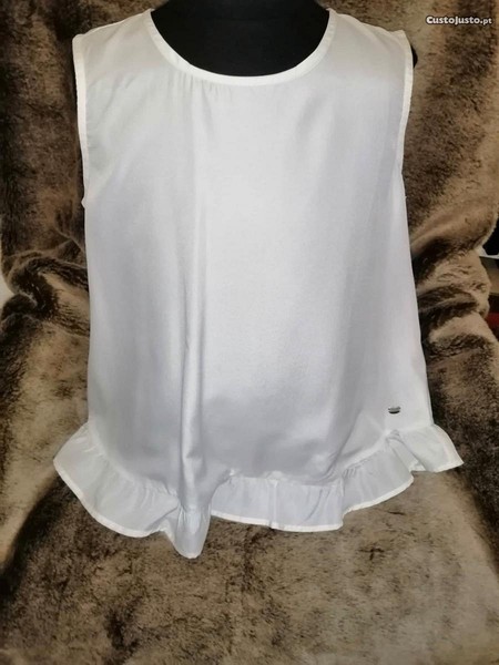 Top branco para menina, da Tiffosi, tamanho 13/14Anos, com aplicação 2 folhos em baixo, por 8EUR+ portes de envio ou passando a levantar em Rio Tinto junto à igreja matriz.