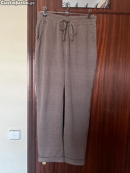 Tem um cordão na cinta, mas só a fazer feitio, com bolsos laterais e dobra na bainha.