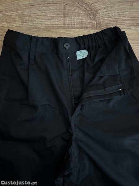 Calças com elástico na cintura o que permite um ajuste mais confortável e sem necessidade do uso de cinto.