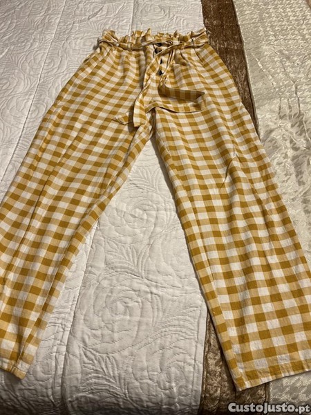 Calças cinta subida, aos quadrados beges e vários tons de mostarda. Da Primark, tamanho 36.
