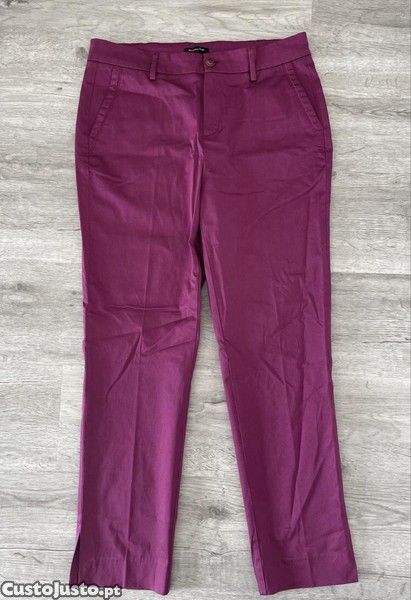 De cor de vinho ou ameixa. Cintura média, com fecho e botão. Tem bolsos à frente e atrás. Com rachas no fundo da perna. Modelo clássico. Material leve.