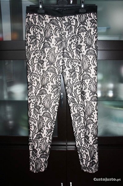 Calças pretas com salmão e com padrão que parece renda da marca ZARA. O tamanho é o S