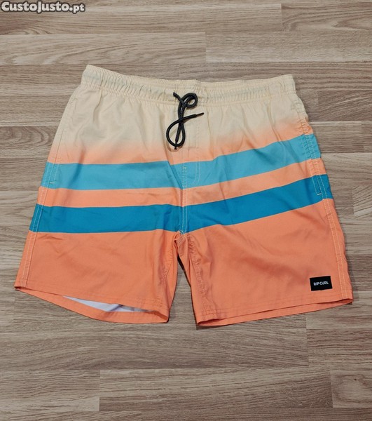 Calções de Praia RIPCURL - Tamanho L - Modelo com padrão em tons de laranja e azul turquesa. - Cintura elástica com cordão. - Bolsos laterais. Entrego em mão na zona do Porto/Gaia. Envio para todo o país.