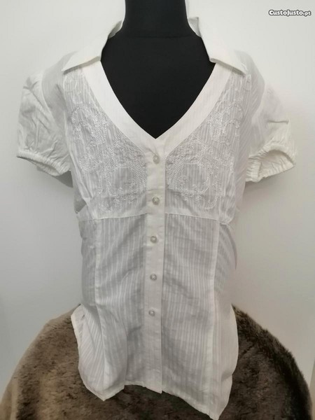Camisa branca, de manga curta, com pequeno elástico nas mangas e parte de drapeado com elástico nas costas, decote em V, com gola, e bordados na parte da frente do decote, 100EUR algodão e produto com português, tamanho S, marca Ella, em excelente estado, por 20EUR + portes de envio ou passando a levantar em Rio Tinto junto à igreja matriz.