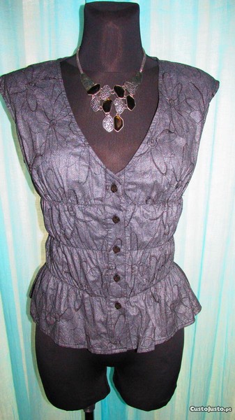 Camisa franzida em cinza escuro brilhante, com bordados em preto no tecido, do Americo Tavar, tamanho M, com decote em bico, foi usada 2x, está como nova, por 10EUR + portes de envio ou passando a levantar próximo à igreja em Rio Tinto .