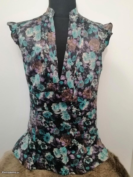 Camisa preta com flores, sem mangas, tamanho S, da Blanco, com pequenos folhos nas cavas, de tecido acetinado, em excelente estado, por 8EUR + portes de envio ou passando a levantar em Rio Tinto junto à igreja matriz.