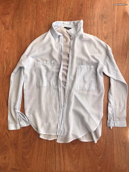 camisa Mango transparente azul. Tem uma pequena mancha na manga como se vê na fotografia.
