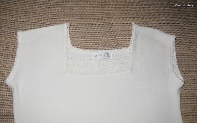 Camisola Pérola , em malhinha decote quadrado orlado em renda de croché com aplicação manual de pequenas pérolas no peito, assim como no contorno do decote e ombros
