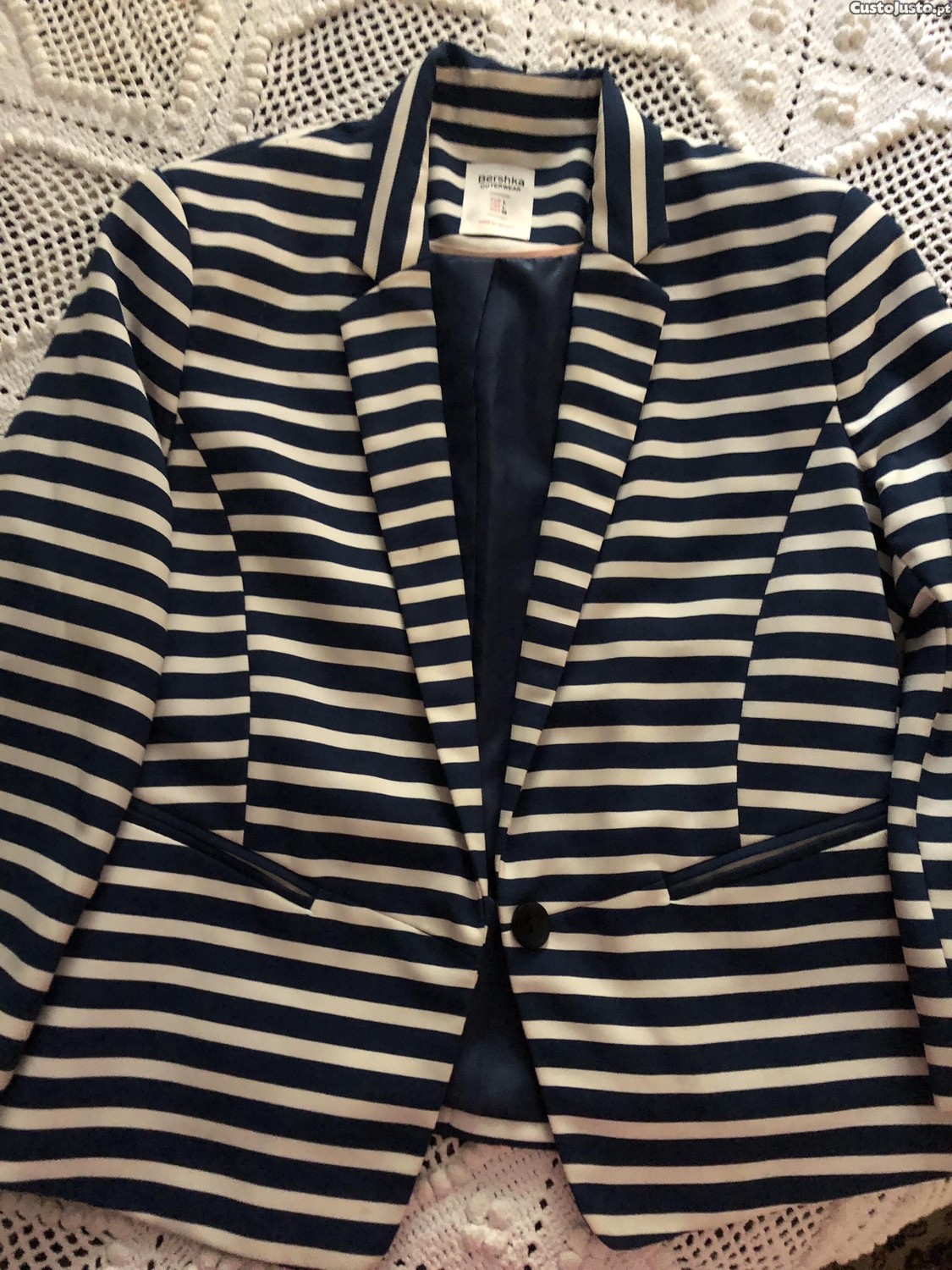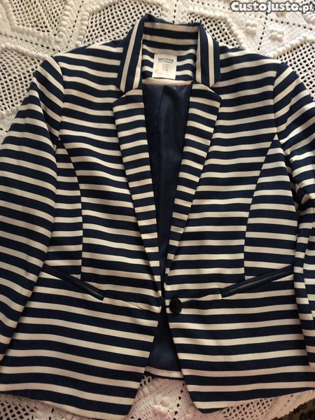Preço: 6 €Casaco curto com classe às riscas azul e branco de qualidade e em perfeito estado , tamanho L