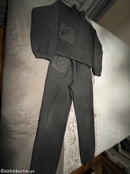 Fato de treino cinza escuro, em tecido tipo pelinho de carneiro raso com bolsos em material de kispo, de menina adolescente (14/15 anos).