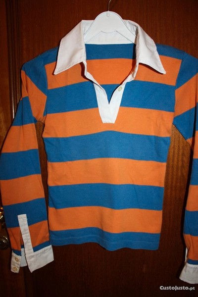 Polo da marca LANIDOR às riscas laranja e azul. O Tamanho é o S.