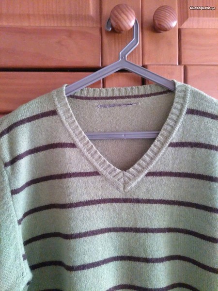 Camisola de malha do tipo pullover verde com riscas pretas à frente. Encontra-se em perfeito estado.