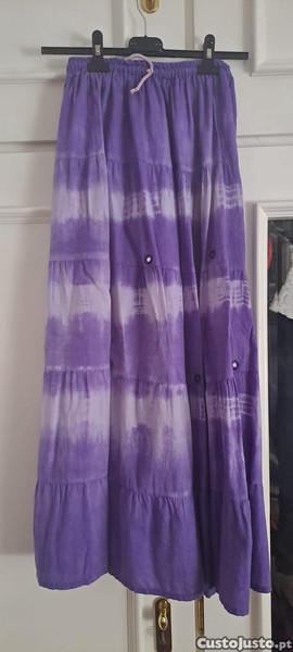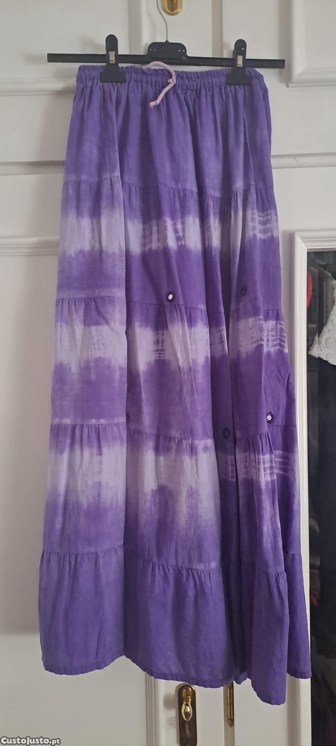 Saia roxa tamanho pequeno (S-M) com alguns sinais de uso visíveis nas fotos. A mancha poderá sair a lavar, nao experimentei. Com espelhos.