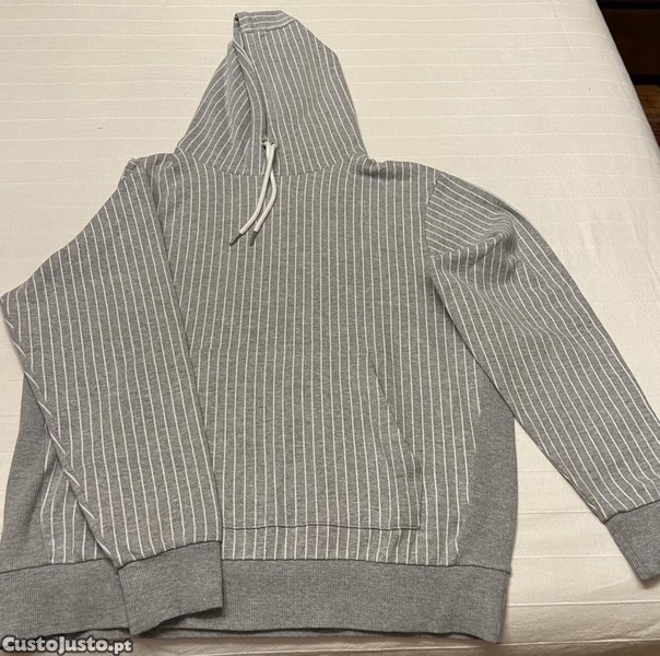 Sweatshirt de homem com carapuço com cordão, punho canelado nas mangas e no fundo da camisola. Tem carda muito leve (quase imperceptível). Cor cinza claro com riscas verticais em branco e nos laterais com malha canelada em cinza mais escuro.