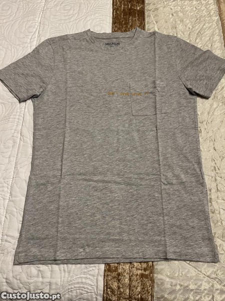 Tshirt de homem, cinzenta, com bolso no peito e uns dizeres em letras de borracha amarelo.